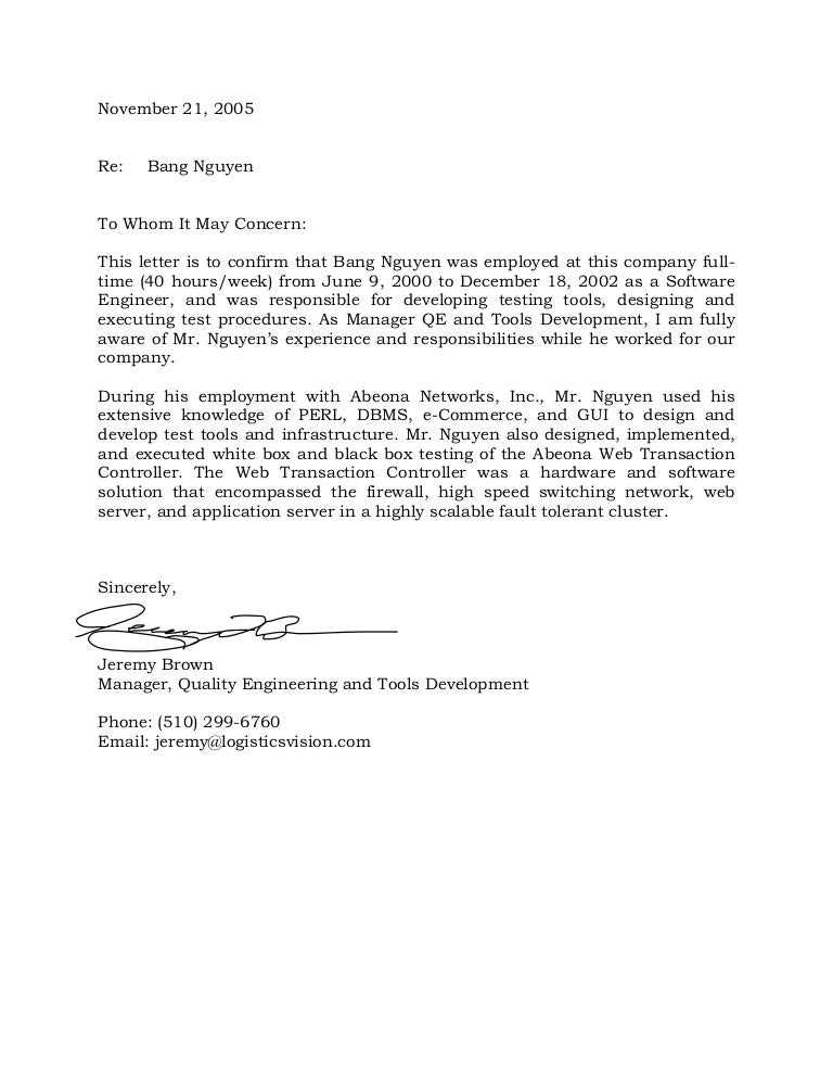 Employment Format Employment To Whom It May Concern Letter / Employment Verification Letter to whom It May Concern ... / If you do not know the name of a specific person or company, address the letter 'to whom it may concern'.. Here briefly focus on sample employment reference letter. For example, you might be sending a cover letter, letter of recommendation, or other job search materials to someone whose name you do not know. As it connotes, the to whom it may concern letter will refer to anyone who will read the document. If this is not possible do not make any comment other than referring to employment dates. When writing physical employment verification letters, use standard business letter format, with your company's contact information, the date and otherwise, use a formal salutation, such as to whom it may concern. employee verification letter for current employee.