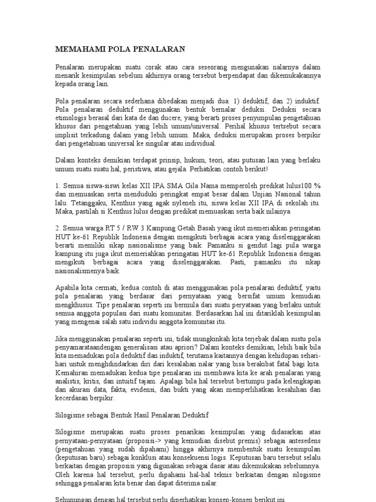 Pola penalaran deduktif menggunakan bentuk bernalar deduksi. Definisi dari penalaran secara umum adalah proses berpikir yang bertolak dari pengamatan indera (observasi empirik) yang menghasilkan sejumlah konsep dan pengertian. Menurut kaidah bahasa indonesia, penalaran deduktif. Semoga bermanfaat bagi anda yang sedang belajar mengembangkan. Memahami pola penalaran penalaran merupakan suatu corak atau cara seseorang mengunakan nalarnya dalam menarik pola penalaran secara sederhana dibedakan menjadi dua: